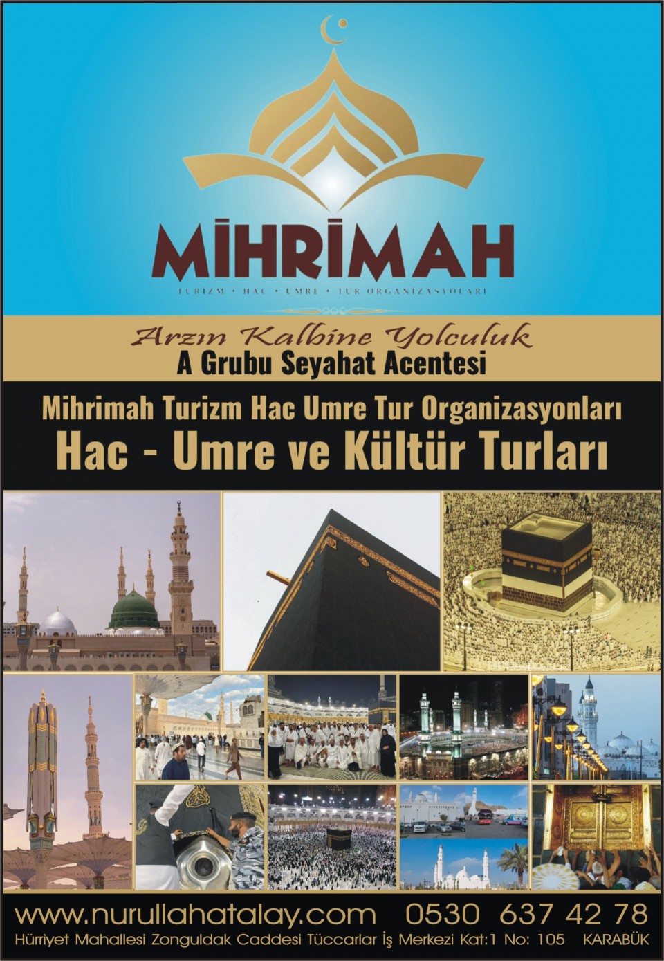 MİHRİMAH TURİZM HAC UMRE TUR ORGANİZASYONLARI Tel: 415 34 78 Gsm: 0530 637 42 78 Hürriyet Mahallesi Zonguldak Caddesi Tüccarlar İş Merkezi Kat: 1 No: 105 KARABÜK |
